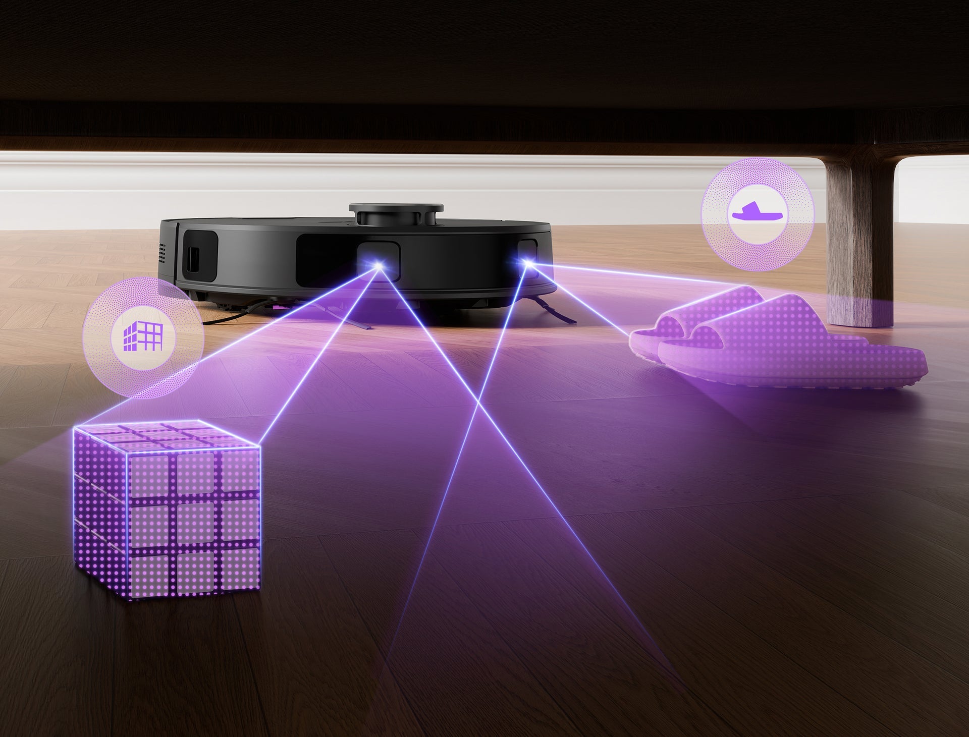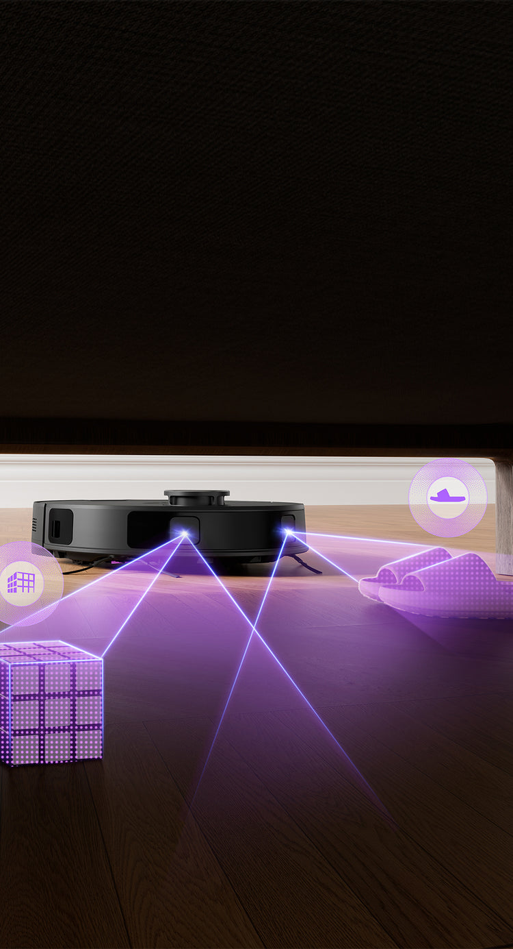 Edistyksellinen DuoDetect AI™ 3D -esteiden välttämistekniikka mahdollistaa puhdistustehtävien uskomisen robotille ilman, että sinun tarvitsee puuttua siihen manuaalisesti sen vapauttamiseksi.