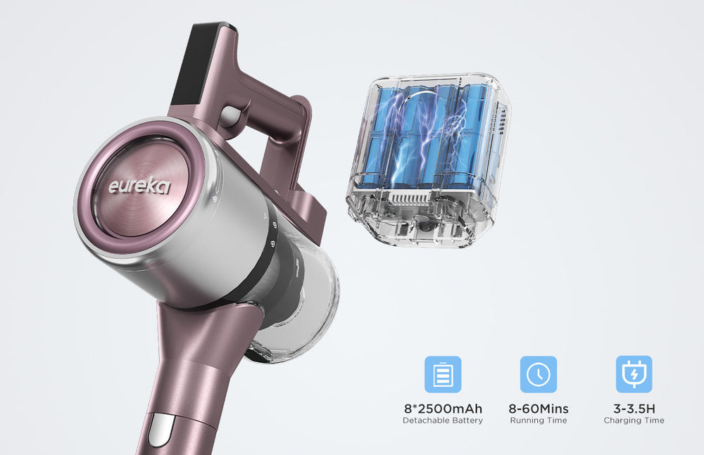 Akun kesto jopa 60 minuuttia kädessä pidettävälle pölynimurille matalassa tilassa, 8*2500mAh suurikapasiteettinen akku, pitkä puhdistusaika, syväpuhdistaa koko talo helposti.