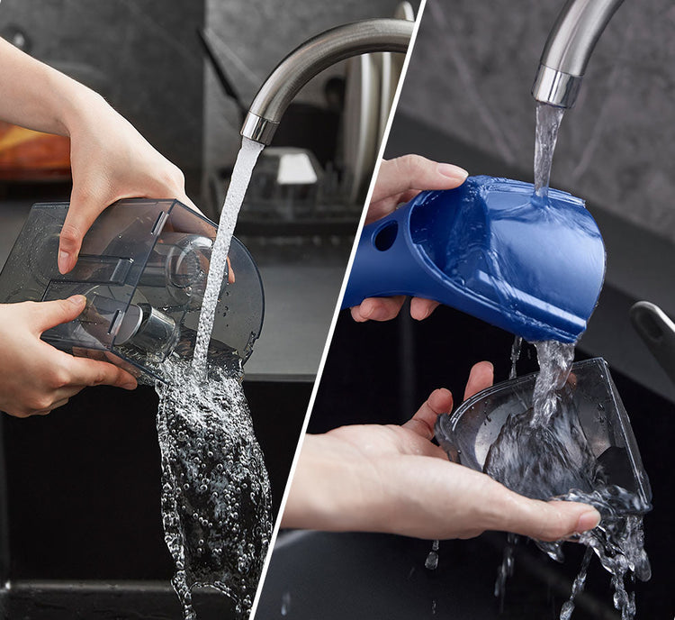 Suuren, läpinäkyvän kaksoissäiliön tilavuus on 50,7 unssia puhtaalle vedelle ja 27 unssia likaiselle vedelle, joten voit jatkaa puhdistusta pitäen puhtaan veden ja likaisen veden erillään.